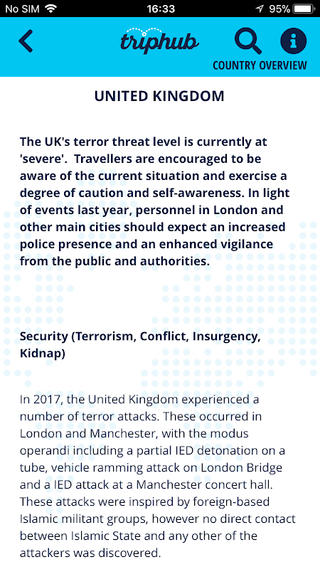 يوفر TripHub مورد موحد للاستخبارات خطر بالنسبة لجميع البلدان والمدن الرئيسية في جميع أنحاء العالم؛ التركيز على الحقائق التي يمكن أن تعتمد على دعم رجال الأعمال في بيئات غير مألوفة. ويمكن للمشتركين البحوث بسرعة المعلومات التي تشمل: