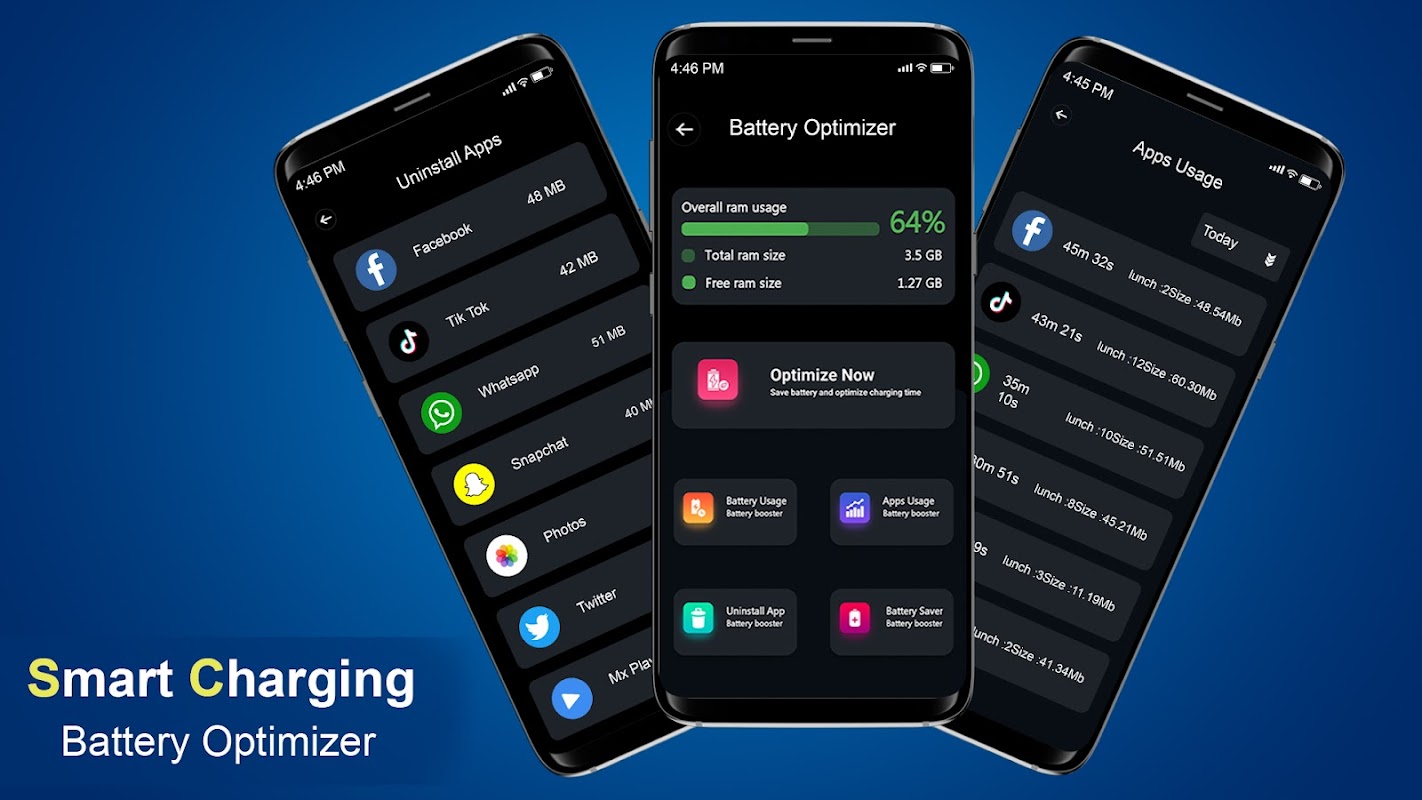 تم تصميم ميزة تحسين البطارية لتحسين الأجهزة الحديثة بطريقة ذكية لزيادة عمر بطارية الهاتف المحمول. يوفر حل تحسين كامل الميزات لجهازك عن طريق إغلاق الأنشطة الحديثة والأنشطة الأخرى التي لا يستخدمها المستخدم واستنزاف البطارية. يعرض التطبيق حالة درجة الحرارة في الوقت الفعلي وتجربة الشحن السريع أثناء الشحن. يتحكم Optimizer في التطبيق الذي يستهلك بطارية الهاتف مثل إغلاق Wi-Fi وبيانات الجوال و Bluetooth وأنشطة الخلفية الأخرى.
