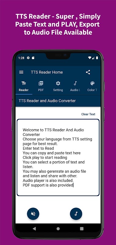 1. قارئ النص إلى كلام (TTS) لأي نص (اكتب النص الخاص بك أو انسخه والصقه ، دعم PDF المقدم).