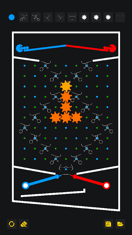 Ball drops. The standard version uses two ramps which store a given number of balls. A switch at the bottom of the board triggers the release of the initial ball (typically blue), from the top left of the panel. The second ramp, on the right, contains red balls.