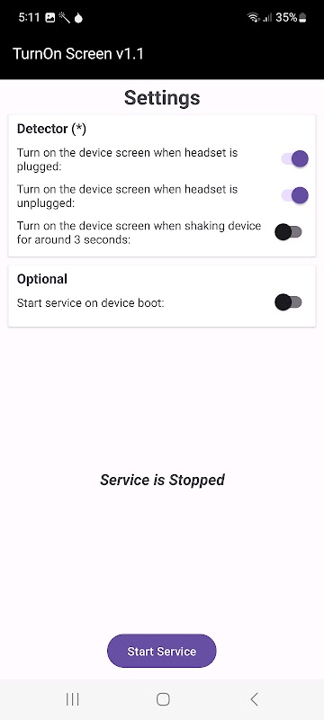 قم بتثبيت هذا التطبيق وفتحه على جهازك، في شاشة التطبيق، هناك عدة خيارات لتفعيل الكاشف. يجب عليك تفعيل كاشف واحد على الأقل حتى تتمكن من بدء الخدمة عن طريق النقر على زر "بدء/إيقاف الخدمة" الموجود أسفل شاشة التطبيق.