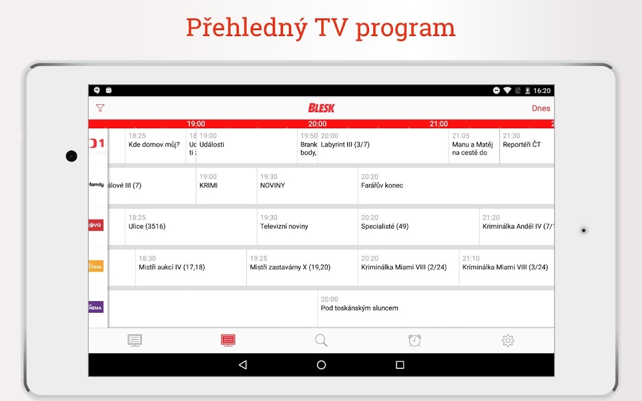 برنامج تلفزيوني واضح بما في ذلك الصور. البرنامج التلفزيوني لأكثر من 120 قناة تشيكيا وسلوفاكيا وأجنبية في تطبيق واحد مجاني تماما. أثناء مشاهدة العرض ، يمكنك الدردشة عبر الإنترنت مع الآخرين وإضافة تقييمات. برنامج الأمس متاح إذا كنت مهتما بما فاتك ، ثم البرنامج لمدة 10 أيام.