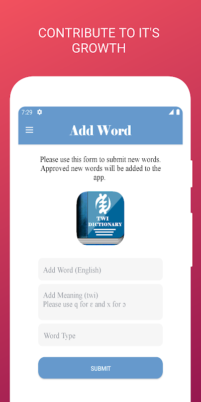 • تقديم اقتراحات كلمة تحت قسم "إضافة كلمة" لدينا. يتم فحص الاقتراحات وإضافتها إلى التطبيق بعد التحقق.