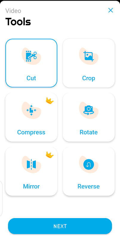 Video Editor with editing features, such as Cut, Crop, Compress, Rotate, Merge, Mirror, Reverse and so on.