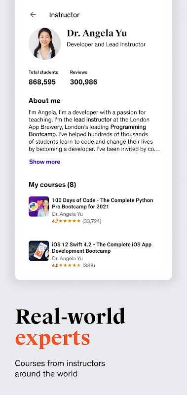 تعلّم من خبراء حقيقيين في مجموعة واسعة من المواضيع، من التكنولوجيا والأعمال إلى التفكير الإبداعي والتطوير الشخصي. بفضل التوصيات المدعومة بالذكاء الاصطناعي، والتنسيقات المرنة، والأدوات التي تناسب سير عملك، يساعدك Udemy على جعل النمو المستمر جزءًا من حياتك اليومية. إليك ما يجعل التعلم باستخدام تطبيق Udemy قيّمًا للغاية: