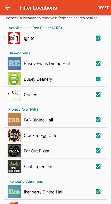 Find out hours of service and what's on the menu up to two weeks in advance, at any of our full-service dining halls: Busey-Evans, Florida Avenue (FAR), Ikenberry Commons, Illinois Street (ISR), Lincoln/Allen (LAR), and Pennsylvania Avenue (PAR). You also can check your meal plan balance and see complete nutritional information right in the app!