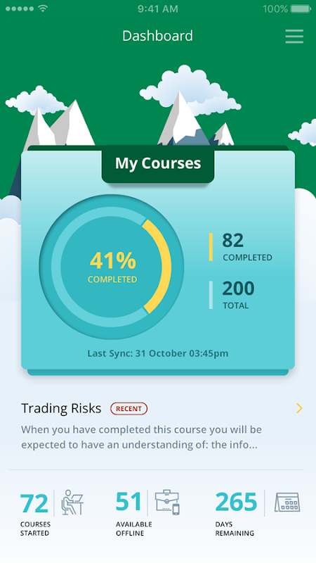 يمكنك الوصول إلى الدورات التدريبية (SCORM 1.2 و HTML 5) عبر فئات وتقييمات متنوعة (مضمنة في الدورات التدريبية) من خلال التطبيق.