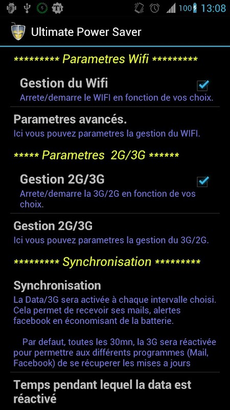 This application will permit you to save the maximum battery by stopping which is no longer necessary when the screen is off (wifi, 3G, etc. ..).