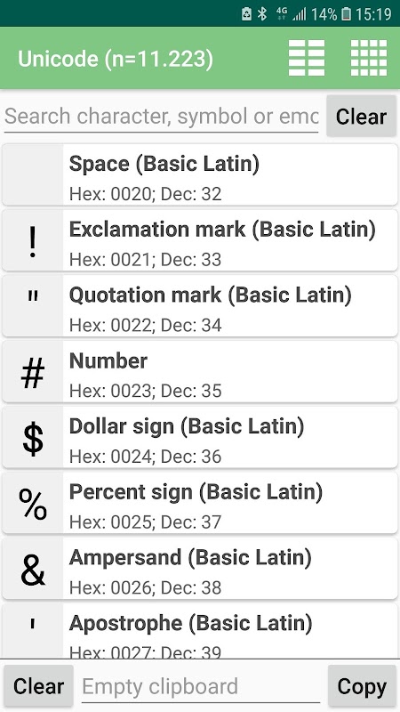 البحث عن وقوائم يونيكود وأيضا الرموز التعبيرية.