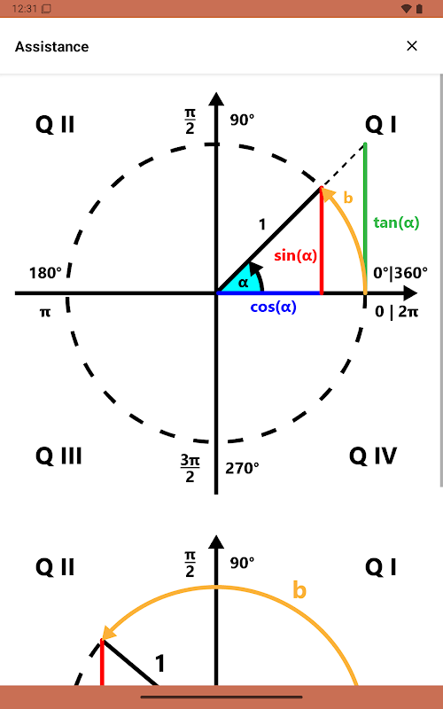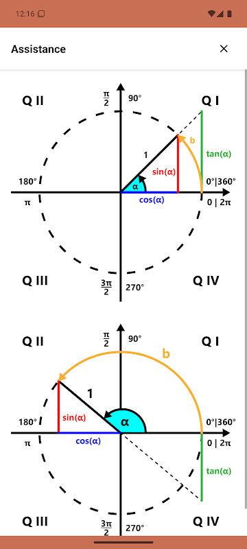 يحسب هذا التطبيق قيم دائرة الوحدة باستخدام أداة علم المثلثات هذه، مع خطوات حسابية ورسوم بيانية ورسوم متحركة - للواجبات المنزلية أو المدرسية أو لدعم التعلم.