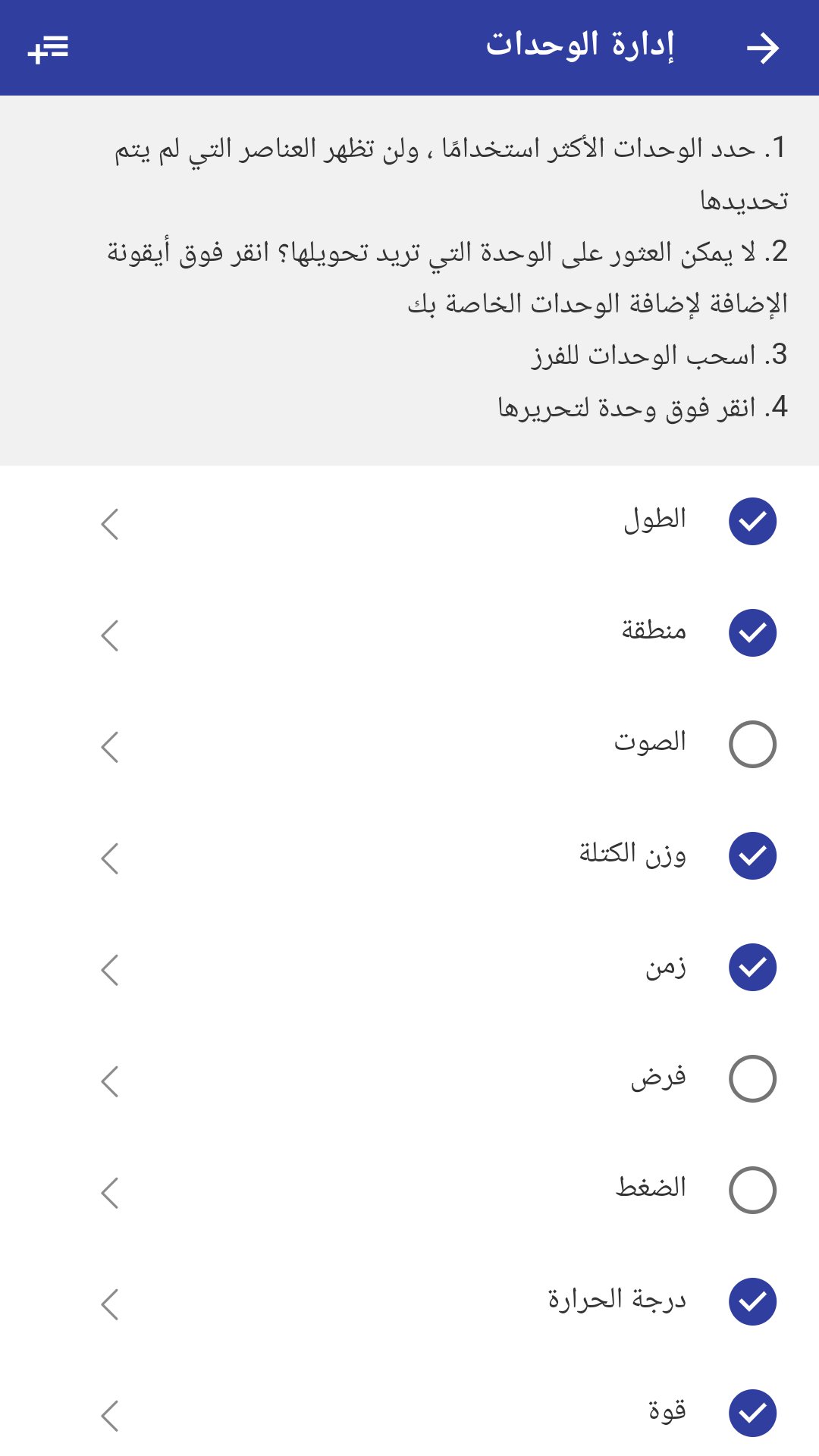 ✓ إدارة الوحدات ، لن تظهر الوحدات غير المحددة