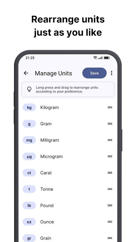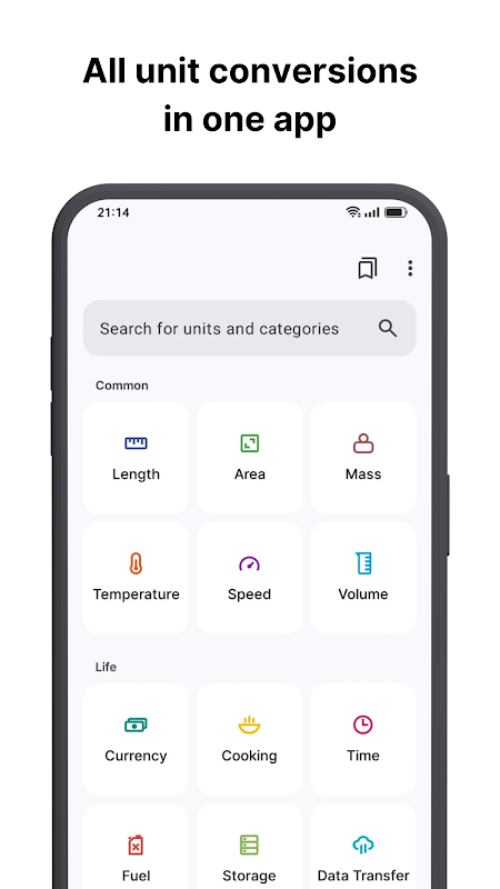 كل ما تحتاجه، لا شيء لا تحتاجه. نؤمن بأن البساطة قوة! لهذا السبب صممنا واجهة مستخدم بسيطة وسهلة الاستخدام ستبهرك من البداية. كل ما عليك فعله هو كتابة الأرقام وستظهر لك نتيجة التحويل فورًا. مهما كانت الوحدة التي ترغب في التحويل منها، فلدينا كل ما تحتاجه. تتيح لك ميزة الإشارات المرجعية الرائعة حفظ جميع تحويلات الوحدات التي تستخدمها بكثرة في مكان واحد. ونسينا تقريبًا ذكر قسم الأدوات الجديد الذي يُمكّنك من حساب مؤشر كتلة الجسم (BMI)، وفرق التاريخ، والضريبة، وغير ذلك الكثير.
