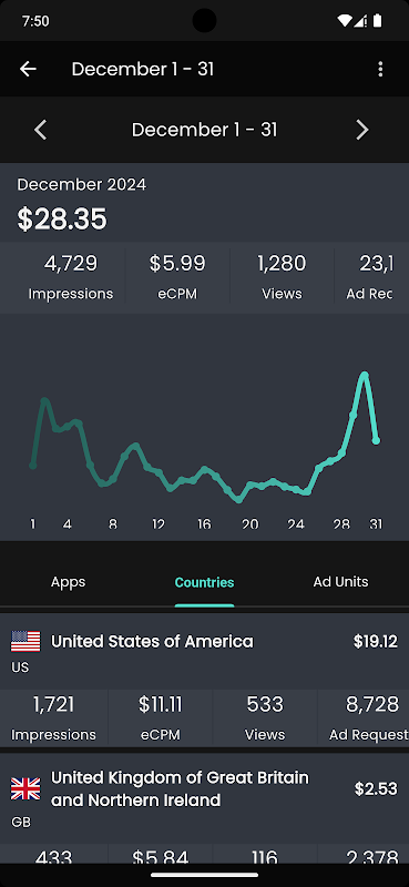- تعرف على ما تكسبه: احصل على صورة واضحة عن أرباحك اليومية والأسبوعية والشهرية والسنوية من الإعلانات داخل التطبيق.