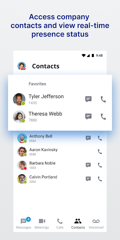 يعمل تطبيق الهاتف المحمول UNIVERGE BLUE CONNECT على تحويل هاتفك المحمول إلى أداة تعاون أساسية، مما يجعل العمل الجماعي أثناء التنقل أسهل من أي وقت مضى. يمكنك إجراء المكالمات وتلقيها، ومعرفة الأشخاص المتاحين، والدردشة مع الزملاء، وبدء مكالمات الفيديو، ومشاركة الشاشات، وإدارة رسائل البريد الصوتي، كل ذلك من تطبيق واحد - في أي وقت وفي أي مكان.