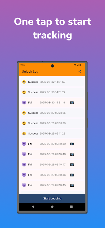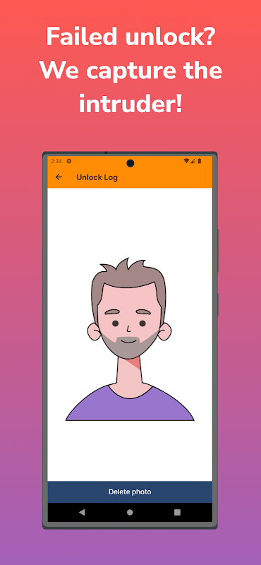 يسجل هذا التطبيق محاولات إلغاء القفل الناجحة والفاشلة على هاتفك. إذا حاول شخص ما إلغاء قفل جهازك، يمكنك التحقق من جميع السجلات. بالإضافة إلى ذلك، إذا فشلت المحاولة، ستلتقط الكاميرا الأمامية صورة للتعرف على الدخيل.