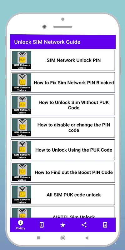 من هذا التطبيق ، ستعرف وتتعلم كيفية فتح دليل شبكة SIM. ستحصل أيضًا على جميع رموز SIM USSD المطلوبة - رمز USSD لجميع بطاقات SIM المحمولة. كيفية فتح سيم بدون كود puk. كيفية فتح دليل طريقة بطاقة SIM. نأمل أن تتمكن من معرفة المزيد من المعلومات حول بطاقة SIM الخاصة بك من التطبيق.