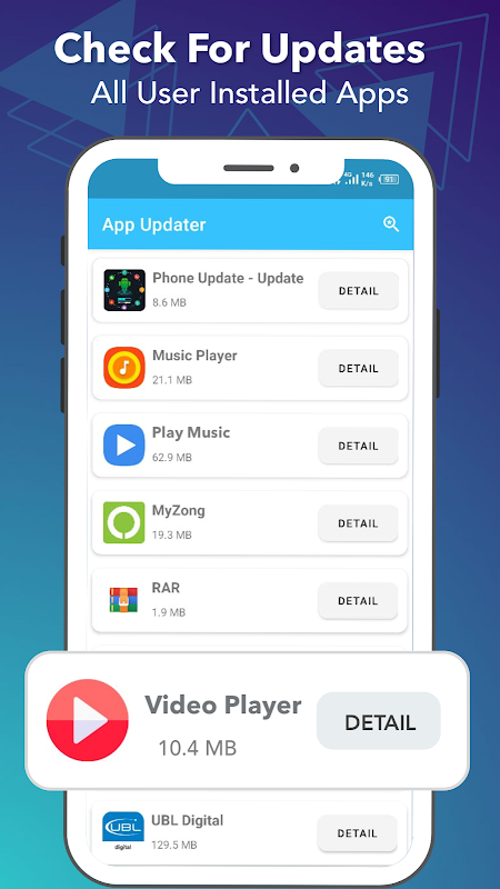 ابق على اطلاع بالإصدارات الجديدة المتوفرة في متجر الألعاب. يتحقق Update All Apps Phone Updater من آخر التحديثات ويحافظ على تحديث تطبيقاتك. هذا هو التحديث الأفضل والسريع لتطبيقات Android. يقوم محدث التطبيق لنظام Android بترقية تطبيقات Android وبرامج نظام التشغيل. يواصل محدث البرامج التحقق من التحديثات ويخبرك بالتطبيقات الوحيدة التي تحتوي على تحديثات متوفرة في متجر الألعاب. قد يحتوي هاتفك على أكثر من 100 تطبيق مثبت وستحتاج دائمًا إلى تحديث هذه التطبيقات باستمرار على جهازك ، لذلك لن تحتاج إلى التحقق من تحديثات التطبيق عدة مرات على متجر Play. يمكنك ببساطة الحصول على قائمة جميع تطبيقات تثبيت المستخدم أو تطبيقات النظام ، حدد التطبيق الذي تريد التحقق من وجود تحديث له ، ثم قم بترقية تطبيقاتك وألعابك. سيساعدك برنامج تحديث مدقق تحديث التطبيق الأحدث على التحقق