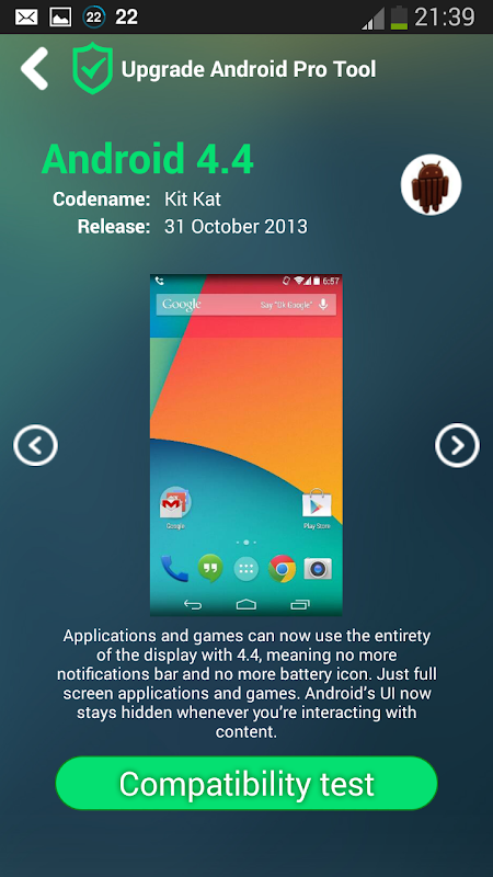 هذا التطبيق قادر على اختبار الجهاز وتحديد ما إذا كان لديه الحد الأدنى من المتطلبات لتشغيل الروبوت نظام تشغيل أحدث، ويمكنك استخدامه لاختبار النظام الخاص بك لكل إصدار الروبوت للتردد وحدة المعالجة المركزية المطلوبة، ذاكرة الوصول العشوائي وذاكرة داخلية. فإنه يتحقق إذا متجذر جهازك وتحديثه.