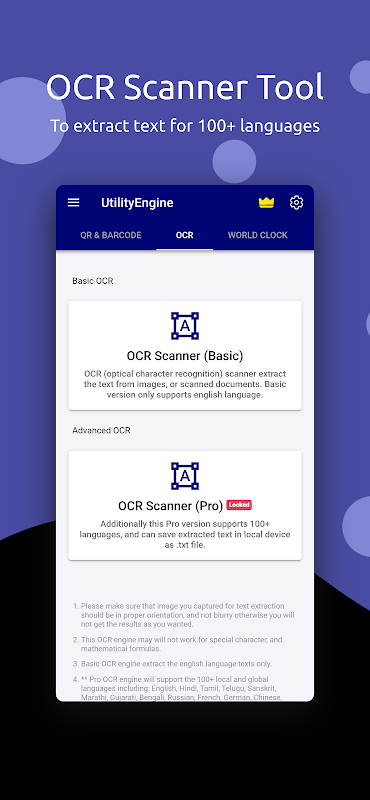 ✅ OCR Scanner Pro الذي يدعم أكثر من 100 لغة محلية وعالمية (بما في ذلك الهندية والتاميلية والتيلجو والبنجابية والغوجاراتية والبنغالية والفرنسية والصينية المبسطة والتقليدية والروسية وغيرها) لاستخراج النص من المستند الممسوح ضوئيًا وتوفير ميزة حفظ وتصدير ملف .txt في الجهاز المحلي.