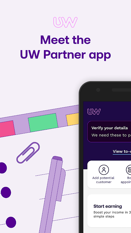 كل ما تحتاجه لإدارة أعمال UW الخاصة بك أثناء التنقل. باستخدام تطبيق UW Partner ، يمكنك: