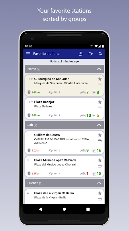 - قائمة المحطات المفضلة مصنفة حسب المجموعات (المنزل، العمل، الأصدقاء أو العام).