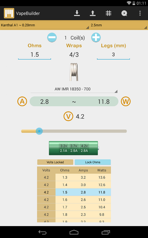 Rapidly save your builds and load any of them back at a later time, so you can get your perfect build for each atomizer and quickly recall it when you need to re-build. All of the selections you have made are saved along with the build, including which battery you were using.