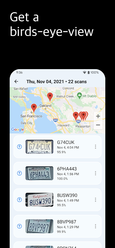تتضمن جميع عمليات المسح الإطار الأصلي الكامل للالتقاط بالإضافة إلى صورة لوحة الترخيص التي تم اقتصاصها. يتم أيضًا تضمين علامة تحديد الموقع الجغرافي وعرضها على الخريطة. يتم دعم عمليات البحث الكاملة والجزئية للوحات.
