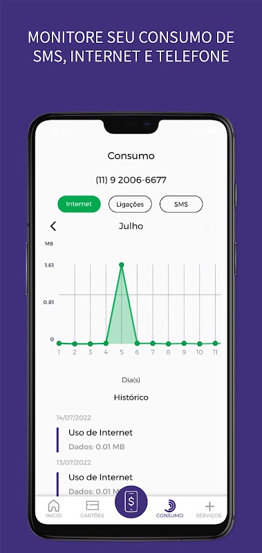 - Histórico das recargas realizadas online (aplicativo, site e por SMS).