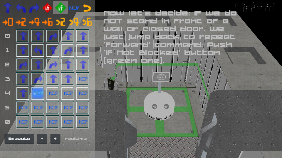 Viadroid lets players gain a practical understanding of basic control-flow concepts like sub routines, loops, and conditionals, just by guiding a mobile platform with commands open doors and find a way to a target place.