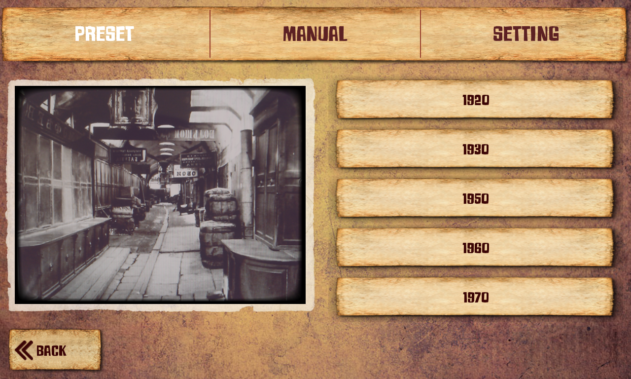 - Preset retro effect filter by years: 1920, 1930, 1950…