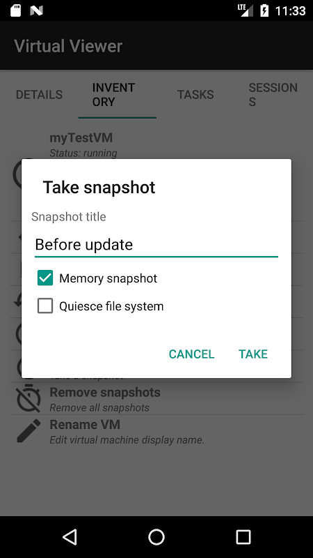 View the inventory, VM details (like OS, tools status, notes, ...), alarms, sessions, general details, recent tasks, storage infos (eg free space) and even answer virtual machine questions. Additional: you can now also take/revert and delete snapshots for free, and rename VMs. The app is ad-free, working with Android 2.3+ and updates are released regularly.