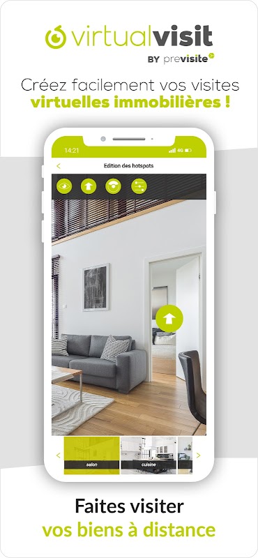 التطبيق VirtualVisit يعطي العاملين في القطاع العقاري والقدرة على خلق 180 ° الجولات الافتراضية مباشرة من الهاتف الذكي الخاص بك. ويمكن عندئذ أن ترسل هذه الجولة إلى أي برنامج العقاري أو الموقع للنشر.