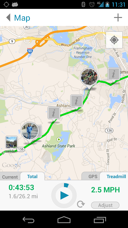 Virtual Walk works as a daily fitness tracker. Virtual Walk automatically keeps track of your time and mileage while you are walking and logs it in a nice format for you to review later. Longer routes can be done in multiple days, as Virtual Walk will save your progress automatically when you are finished, so that you can start where you left off tomorrow.