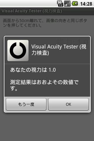 Stay about 50cm away from the screen, and push the button on the same orientation as the image. Measurement VA is approximate value. 1.0 corresponds to 20/20 or 6/6.