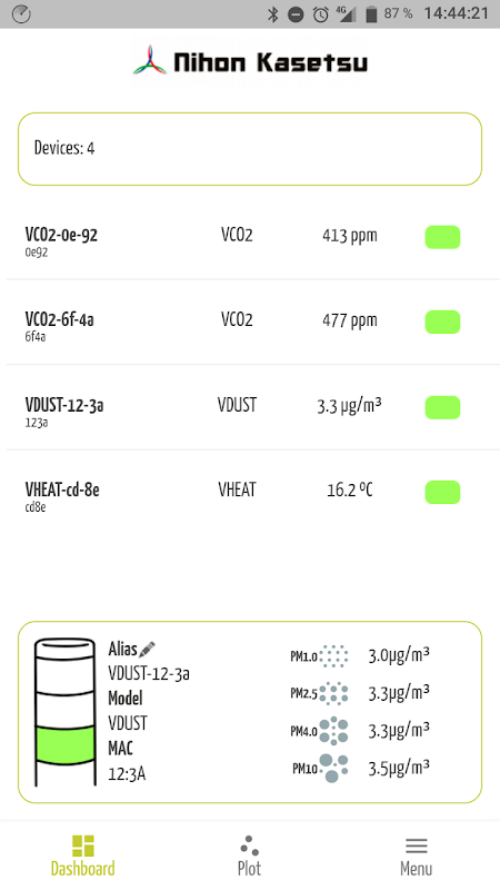 يتيح التطبيق المرئي للمستخدم توصيل الهاتف المحمول أو الكمبيوتر اللوحي بوحدة الاستشعار المرئي ضمن قائمة الأجهزة الموجودة في منطقة قريبة ، وتصور حالة وحدة الاستشعار المرئي وقيمها الحالية المقاسة وتنزيل البيانات المحفوظة.