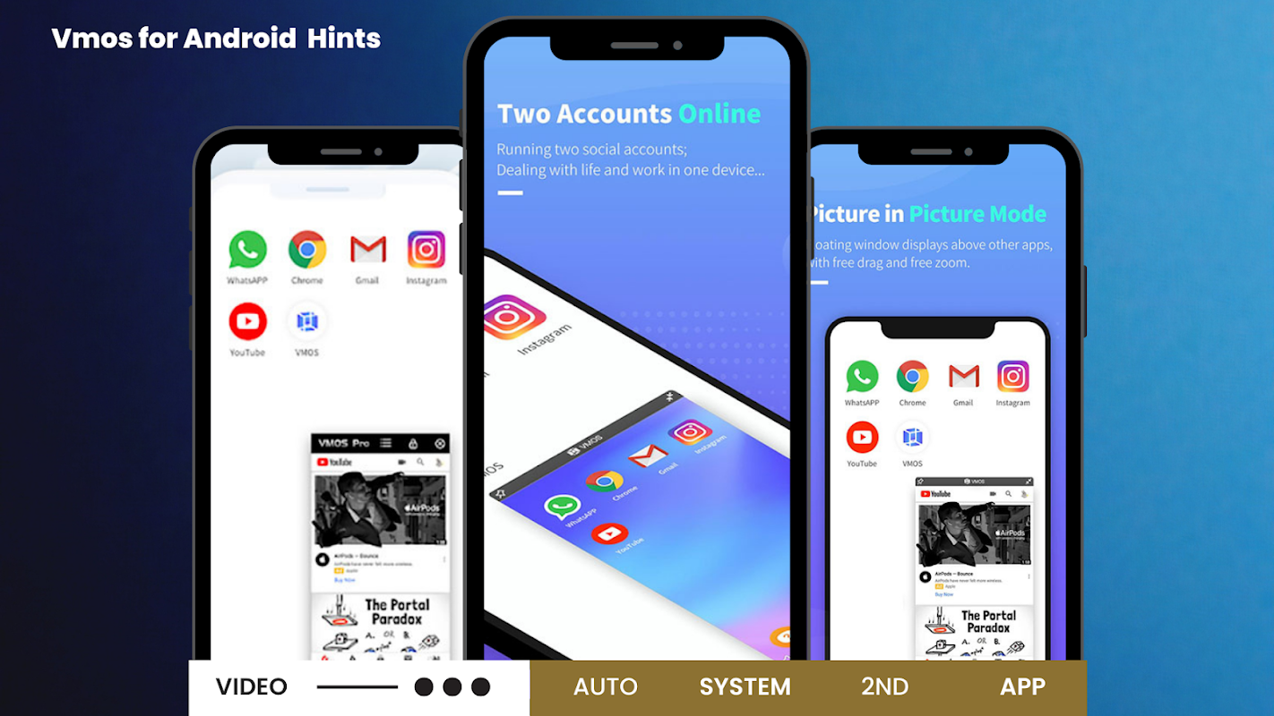 Vmos pro for Android Hints provide tips for duplicates your android system, running them simultaneously on mobile phones as parallel space. Vmos pro for Android Hints provides faster performance guide to clone apps, manage multiple accounts, protect privacy and enjoy the double fun of your dual apps.