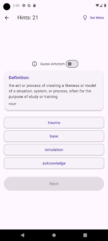وضع التدريب: خمن الكلمات بناءً على التعريفات، مع تلميحات اختيارية مثل المتضادات والجمل النموذجية.
