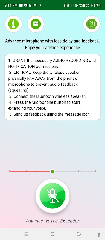 هذا تطبيق ميكروفون، يهدف إلى تشغيل الصوت عبر مكبرات صوت إضافية (مضخمات صوت) متصلة بهاتفك عبر البلوتوث أو سماعات الرأس. صُمم هذا التطبيق للاستخدام في حالات الطوارئ، في المحاضرات والتجمعات العامة، لتوصيل الصوت إلى الجمهور. من مزايا التطبيق انخفاض سعر مكبر صوت البلوتوث.