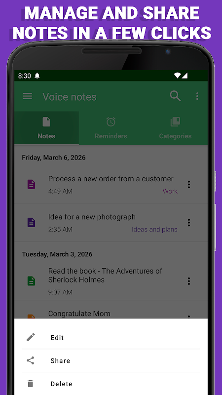 أحد التطبيقات التي تسمح لك لتسجيل بسرعة وسهولة ملاحظات قصيرة، وكذلك الأفكار الهامة مع مجموعة التذكير باستخدام التعرف على الكلام.