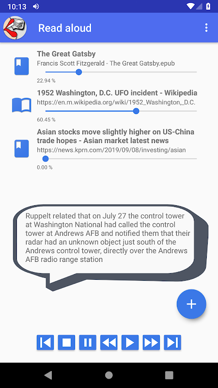 ما عليك سوى مشاركة عنوان URL من متصفحك، أو لصق نص من الحافظة، أو فتح ملف مباشرة في التطبيق. وهو يدعم العديد من تنسيقات الكتب والمستندات الإلكترونية مثل PDF وEPUB وTXT وHTML وRTF وODT وDOC وDOCX وFB2. بفضل الدعم الإضافي لموجزات RSS، يمكنك الآن الاستماع إلى مدوناتك ومواقع الأخبار المفضلة لديك أثناء التنقل.