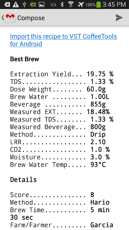 • قياسات المحفوظة والحسابات وتشمل TDS، استخراج الغلة، الجرعة، المشروب المياه، وكميات المشروبات، المشروب جزئي أو بدوام النار، المشروب طريقة (كل الطرق مدعومة)، الضغط، درجة الحرارة، قبل التسريب، مطحنة / إعداد، مشوي، مشوي التاريخ، مشوي نمط، مزرعة / فارمر، باريستا اسم / ملاحظات، تذوق نقاط وأكثر من ذلك بكثير.
