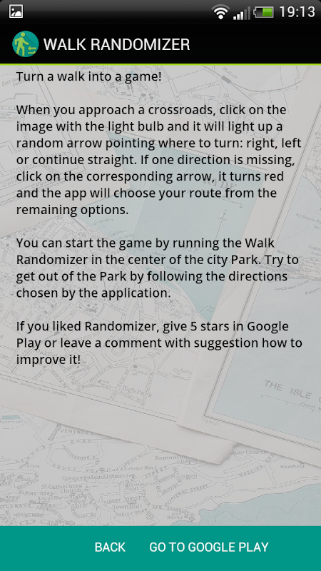 يمكنك بدء اللعبة عن طريق تشغيل المشي بشكل عشوائي في وسط المدينة بارك. محاولة للخروج من الحديقة عن طريق اتباع الإرشادات التي اختارها التطبيق.