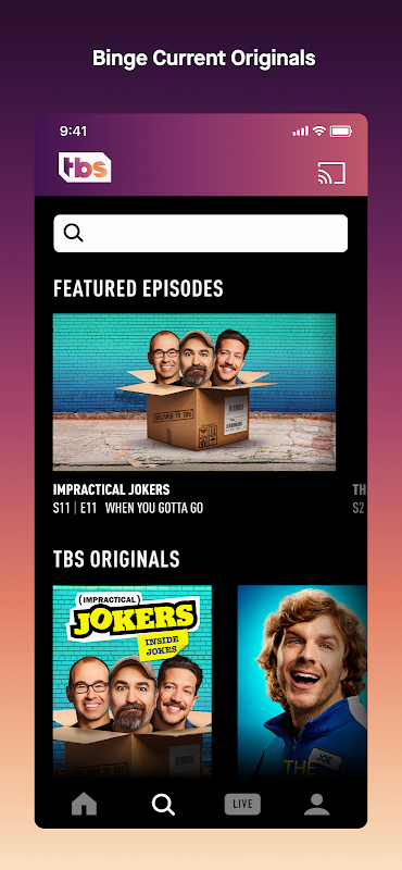 يجعل تطبيق tbs مشاهدة الأفلام والحلقات الكاملة لبرامجك المفضلة أمرًا سهلاً! قم بتسجيل الدخول مع موفر خدمة التلفاز الخاص بك لمشاهدة جميع عروض tbs الأصلية التي تحبها: All Elite Wrestling: Dynamite وAEW: All Access وAmerican Dad وWipeout والمزيد. بالإضافة إلى ذلك، لا تنسَ الأفلام الكوميدية الناجحة مثل Young Sheldon وThe Big Bang Theory وFriends وModern Family! شاهد في أي وقت وفي أي مكان باستخدام تطبيق tbs. يمكنك أيضًا مشاهدة الأحداث الرياضية الحية (بما في ذلك ألعاب MLB وMarch Madness) والأفلام الرائجة - على أي شاشة.