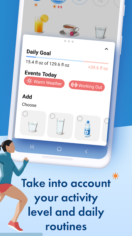 بالإضافة إلى ذلك، لديك الفرصة لإنشاء خطة خاصة بك - على سبيل المثال، لشرب الماء وفقدان الوزن. أو لضمان استهلاك جيد للماء أثناء النشاط البدني. قم بإدخال مشروبات مختلفة، وأضف مشروباتك المفضلة الخاصة لمراقبة توازنك المائي بشكل صحيح. يمكنك استخدام برنامج للتخسيس بواسطة متابعة استهلاك الماء. سيساعدك التطبيق أيضًا في الحفاظ على لياقتك وصحتك عن طريق تذكيرك بشرب الماء بانتظام.