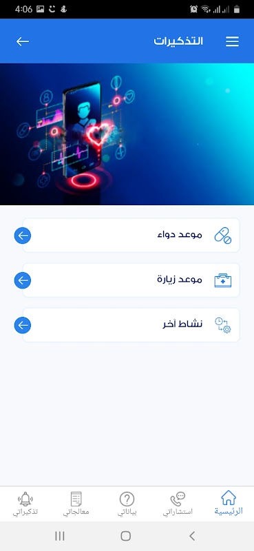 يتيح التطبيق للمستخدم إضافة تنبيه لموعد دواء أو موعد زيارة أو أي نشاط آخر.