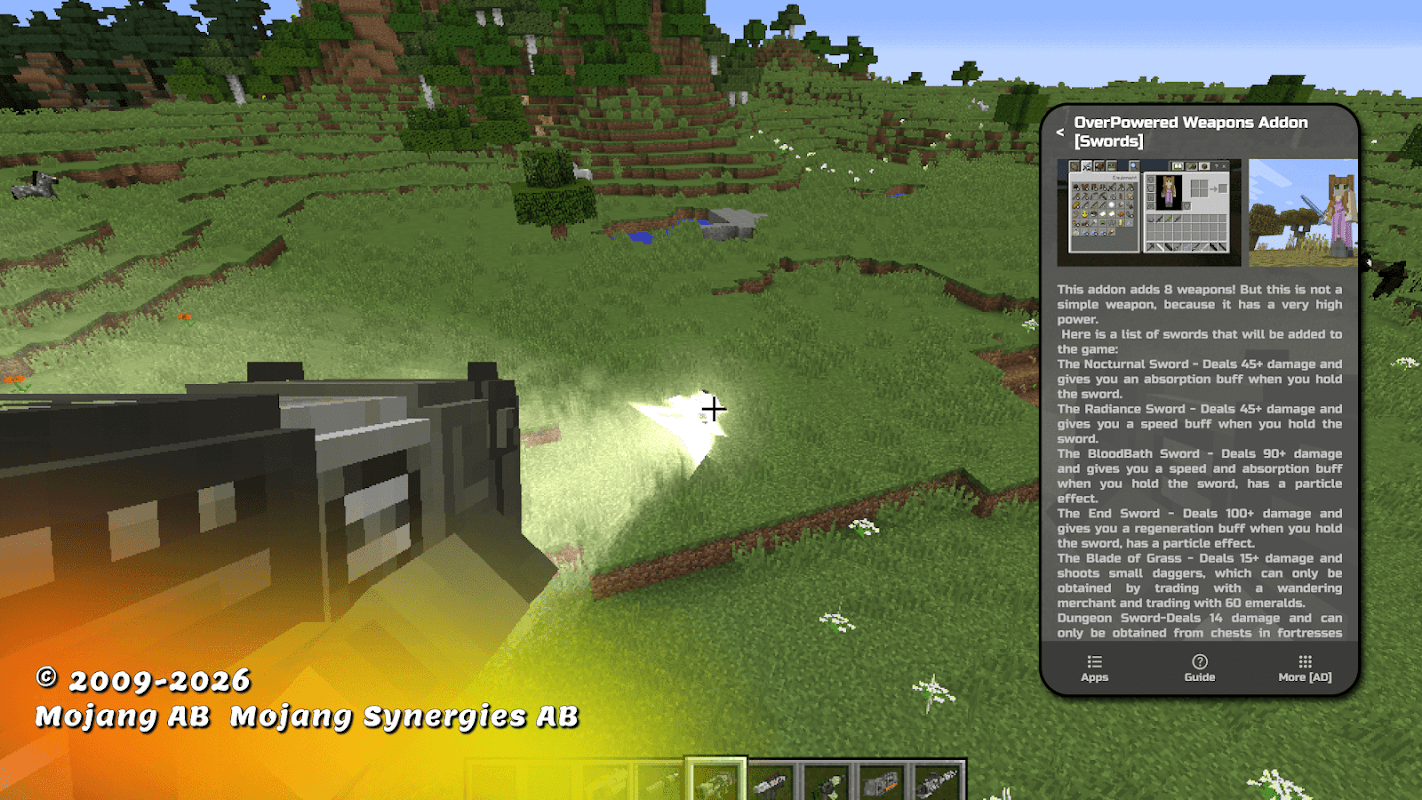 هل سئمت من تحمل حقيقة عدم وجود تعديلات على السيف والأسلحة في اللعبة؟ هل تريد تعديل السلاح في لعبتك؟ توقف عن تحمله - أضف كتالوج التعديلات الخاص بنا لـ mcpe! تعال إلى حسابنا ، لأن لدينا فقط تعديلات mcpe. بالإضافة إلى ذلك ، فهي سهلة التثبيت للغاية! من خلال بضع نقرات فقط ، ستحصل على تعديل أسلحة رائع لـ mcpe! دعنا نتحقق من مدى روعة وقوة السلاح mcpe الذي يمكنك الحصول عليه وما إذا كان جميع أصدقائك سيحبونه!