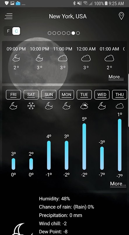 يوفر التطبيق الطقس أيضا الضغط الجوي، والظروف الجوية، ومسافة الرؤية، والرطوبة النسبية، وهطول الأمطار في مختلف الوحدات، ونقطة الندى، وسرعة الرياح واتجاهها، بالإضافة إلى عشرة أيام في المستقبل وتوقعات الطقس كل ساعة.