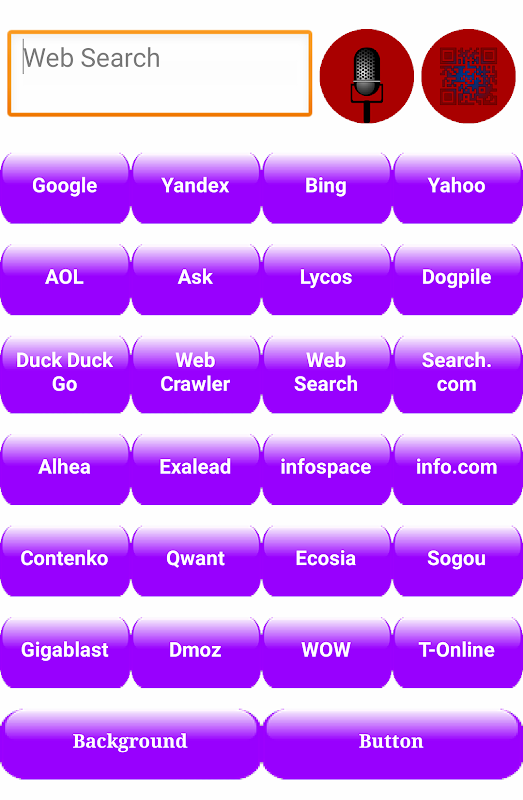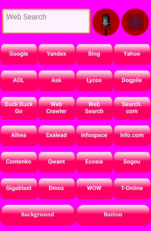 The best search engines are ready at your fingertips such as Google, Yandex, Bing, Yahoo and many more. You can create the Search app according to your color scheme by opening the Background and Button menu at the bottom. There you can select many backgrounds, buttons and text colors freely and create your search app according to your color palate. Type your keyword into the text field or speak the word pure. As well as a barcode scanner you can use for example to scan a product and search in the search engines by clicking and compare in the best search engines. You only have to enter your search keyword or scan the product EAN / QR. Then you can select your favorite search engines or click to search for more search results such as how to open multiple search engine apps one at a time or open and search with all engines in the web browser at the same time. The web search engines app is easy to use and allows for uncomplicated searching and quick comparing in the world wide web!