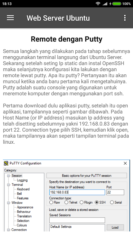 Aplikasi ini berisi tentang cara membangun sebuah web server pada server fisik ataupun pada VPS. Dalam tutorial ini tidak dijelaskan cara install ubuntu server, jadi pelajari sendiri cara installnya. Konfigurasi dilakukan secara text base lewat Putty, aplikasi pendukung lainnya seperti LAMP (Linux Apache, MySQL, Php) serta PhpMyadin di instal langsung lewat putty. Sedangkan untuk upload file ke htdocs (www) pakai WinSCP. Semoga aplikasi ini bermanfaat bagi anda yang ingin membangun web server dengan linux baik pada server fisik atau pada VPS.