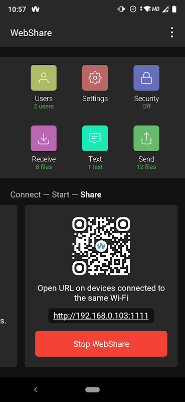 WebShare هو تطبيق Android يمكّنك من مشاركة الملفات والنصوص محليًا بسهولة باستخدام المستعرض الخاص بك. بفضل واجهته سهلة الاستخدام وميزاته القوية ، يبسط WebShare عملية مشاركة البيانات بين الأجهزة المتصلة بنفس الشبكة.